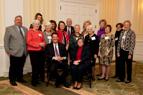 Current and past members of the UMW Board of Visitors gathered February 20, 2014, at the Jepson Alumni Executive Center to recognize the service of former board members Pamela J. White ’74, Daniel K. Steen ’84, and Mary Jones Berry. The three retiring board members were officially inducted into the Simpson Circle.