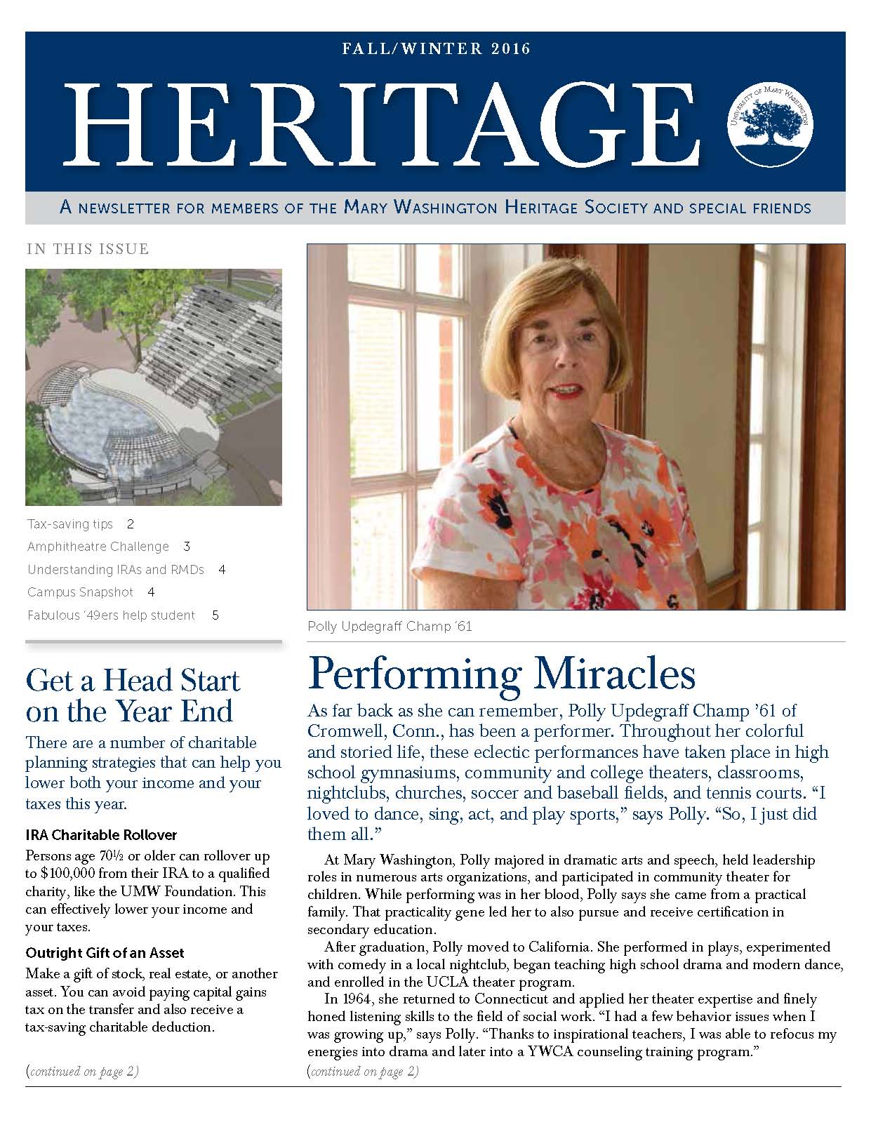 Heritage Newsletter November 4, 2016 by Donna Harter Leave a Comment Read the latest Heritage Newsletter featuring stories of Mary Washington alumni who have made specific plans to support UMW students and programs. Learn helpful tips to aid in year-end giving.