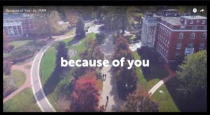 The virtual event was led by two UMW student scholarship recipients and featured remarks and updates from President Paino. The new custom video, “Because of You,” was shown for the first time, as well as a new virtual performance of our Alma Mater. See the links below to watch segments from the event, as well as the two featured videos. (Note: Approximate running times for each segment are noted in parentheses.)
