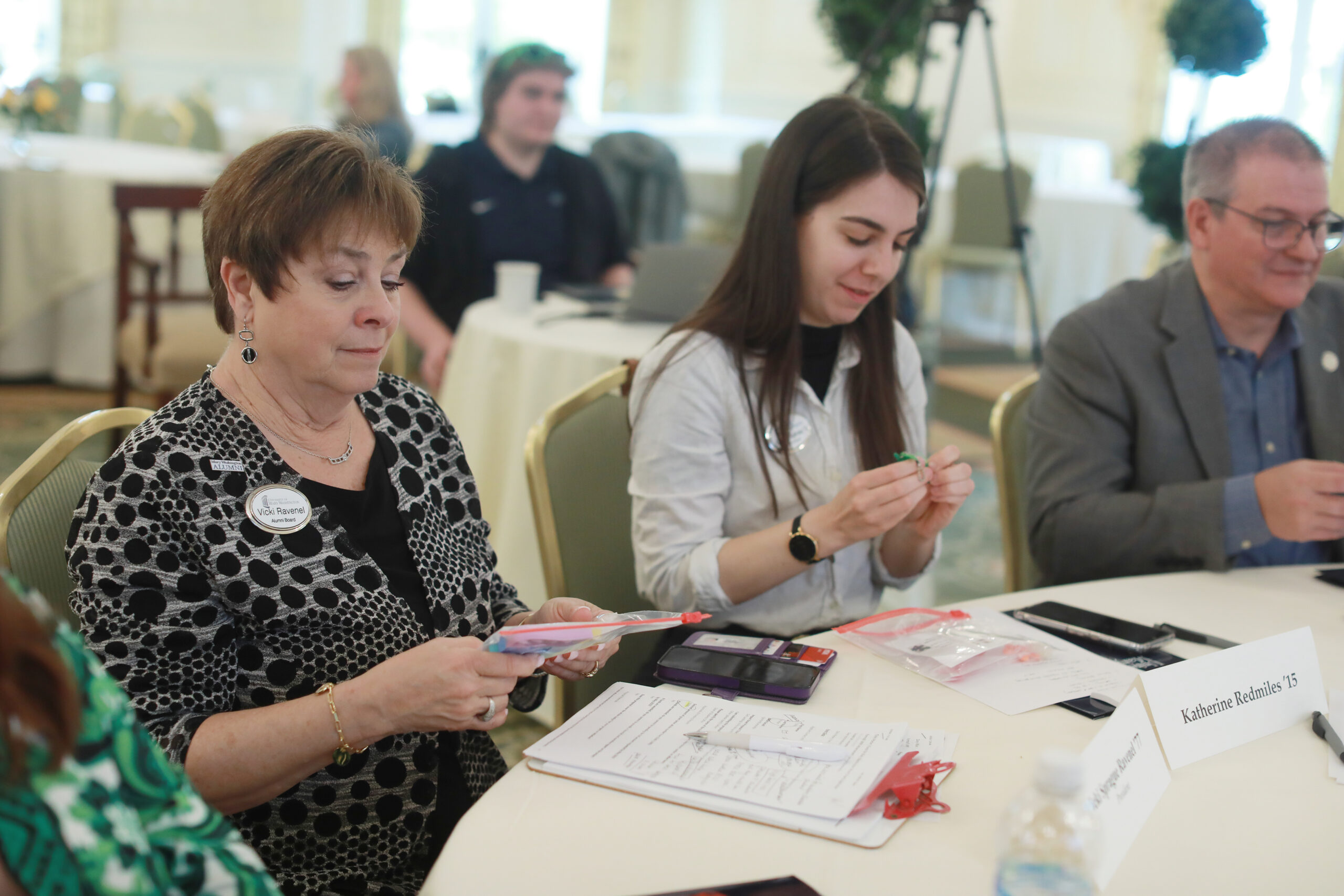 From left: Alumni Board Past President Vicki Sprague Ravenel ’77, member Katherine Redmiles ’15, and Board President James Llewellyn ’87, examine sensory toys that CJ handed out before her presentation. Photo by Karen Pearlman.
